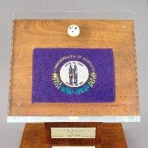 This presentation piece displays moon rocks collected by the Apollo 11 astronauts as well as a miniature Kentucky flag. The piece has a beveled wooden base with a rectilinear post. A triangular wooden block is joined to the top of the post. A Plexiglas cover is nailed to the slanted face of the block over a miniature Kentucky flag. A crystal sphere containing moon rocks is glued to the top of the Plexiglas. Aluminum plates bearing inscriptions are glued to post and on post's foot. |